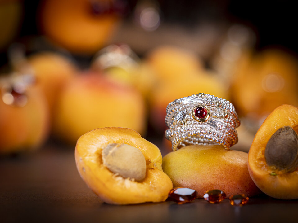 „Schneeweißchen“ - Goldenes Herz in weißer Brust.Ring: 925/-Sterlingsilber, 750/-Gelbgold. Mittelstein: Roter Turmalin, Cabochon.